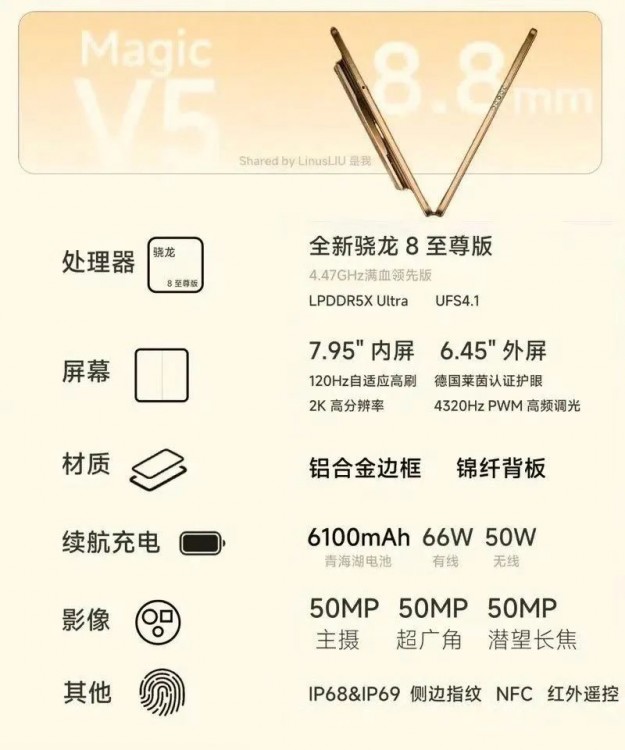 Также ожидается, что Magic V5 будет защищён от пыли и влаги по стандарту IP69/IP69K. Большинство существующих складных смартфонов имеют класс защиты IP48, однако прогнозируется, что производители нового поколения устройств повысят этот уровень. Согласно источнику, смартфон также получит ИК-порт и модуль NFC.