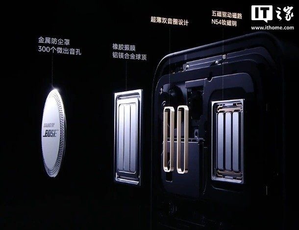 На задней панели — металлическая рамка вокруг модулей камер, справа от которых расположен внешний динамик и надпись Sound by Bose. Производитель заявляет акустическую систему 2.1 с сабвуфером.